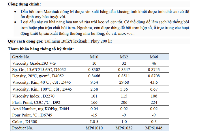 Maxihub T32 là một loại dầu bôi trơn chất lượng cao, được pha chế đặc biệt để đáp ứng nhu cầu bôi trơn của nhiều loại máy móc và thiết bị công nghiệp hiện đại. Nó được tạo ra từ dầu gốc khoáng tinh chế kết hợp với các phụ gia hiệu suất cao, mang lại khả năng bảo vệ và bôi trơn vượt trội.